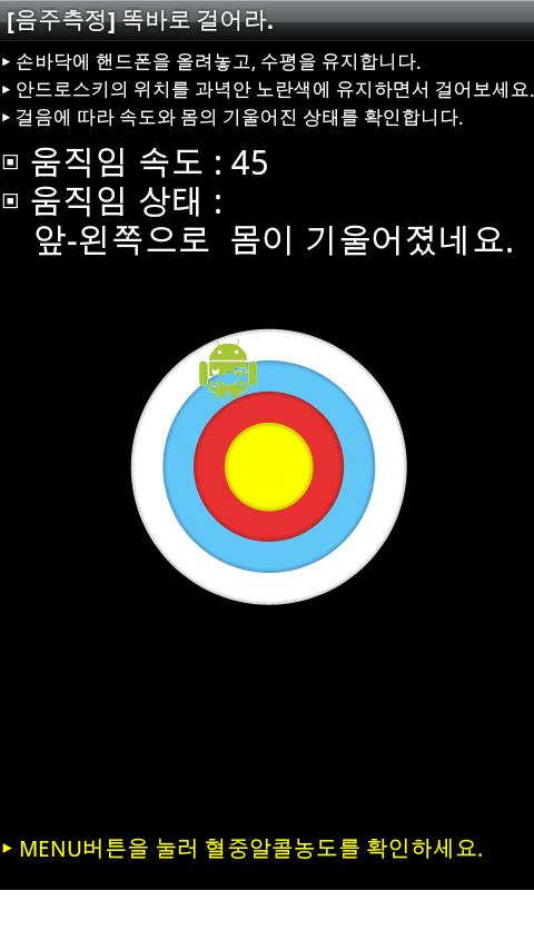 2. 앱을 실행시키고, 과녁의 노란색에 안드로스키가 위치하도록 유지하며 걷습니다.