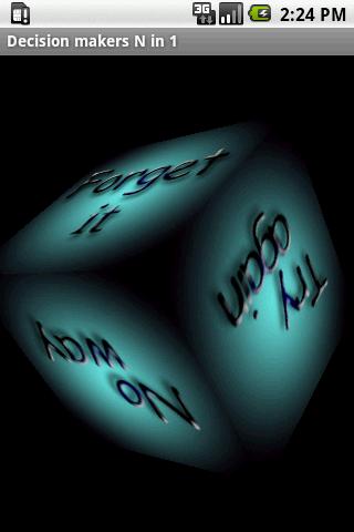 not sure what to do today (work, party..) or need general advice (yes, no ..) - just swipe your finger to the direction you like and you will get advice. Press menu button to switch decision makers.