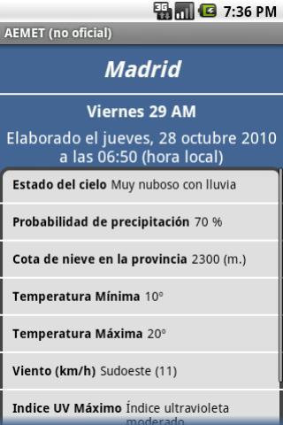 Aplicación que permite consultar el tiempo de la Agencia Estatal de Meteorología (AEMET). No se trata de una aplicación oficial, no está patrocinada, mantenida ni apoyada por AEMET.