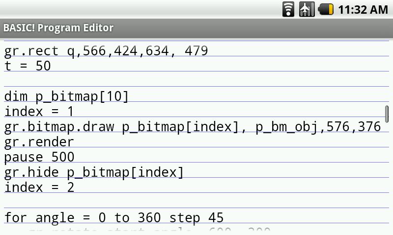 RFO BASIC! is a dialect of Dartmouth Basic that allows you to write and run programs directly on your Android device. It provides powerful text, numeric, audio, Android sensors,GPS,SQL database and Graphics manipulation capabilities. Your programs and data files are stored on an SD Card.