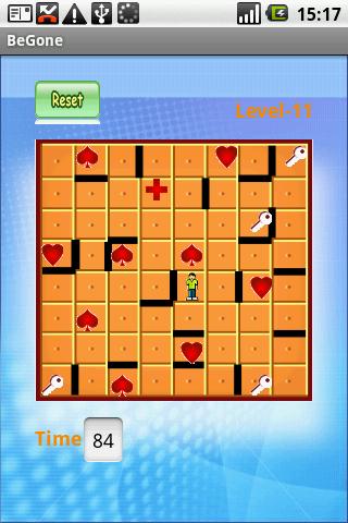 BeGone is a simple but addictive game. Rich graphics and addictive game play will glue you through difficult levels ranging from Level 1 to Level 5. All you have to do is help the man to reach the key within the stipulated time or you lose. Once a direction key is pressed the man travels till an obstacle is reached.