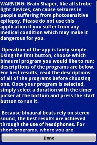Brain Shaper is a binaural beat based brainwave entrainment app. It contains 11 different entrainment sessions designed to relax or invigorate the mind. Unlike other brainwave apps, this one features a flashing light pattern in addition to the sounds, to mimic brainwave goggles.
