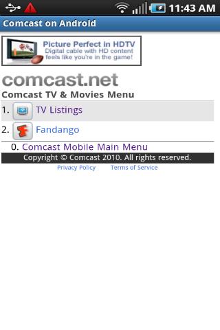 This app shows TV & Movies listings, News & Sports, Weather, Fun & Games from Comcast.net mobile. It is one of the series of On Android apps that JpWirelessTech is developing for the smartphone. This app does not belong and is not affiliated with Comcast.net. You will be dealing directly with Comcast.net site.