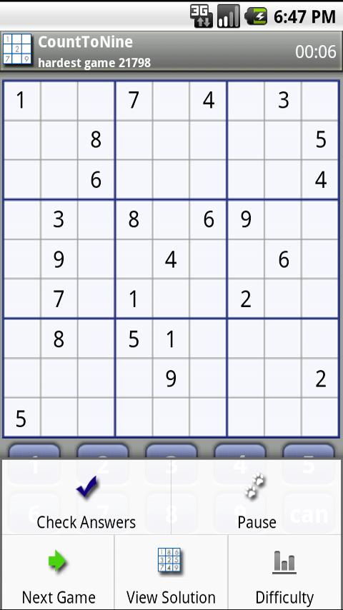 This is a fun, simple and free version of the classic sudoku game, brought to you by Count To Nine Sudoku. This version allows candidates and error checking as well as timed for skill.