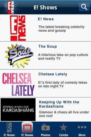 The very best of E! is available for your Android phone! It’s never been easier to access the entertainment news, photos and videos that you cant live without. Stay connected with E! News videos and catch clips of your favorite E! shows like The Soup.