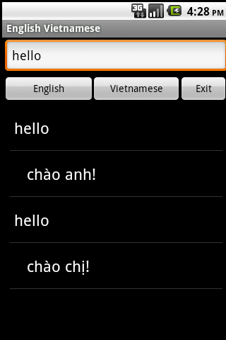 English Vietnamese Dictionary with Learn mode - displays a list of translated words in Vietnamese which also translates from Vietnamese to English. Copying a word from the translated list for a reverse translation can be used to find synonyms and to understand the broader use of the Vietnamese word in the English language.