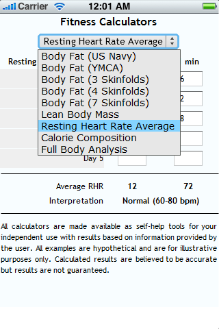 A set of health and fitness calculators like those used by personal trainers and health professionals, including: