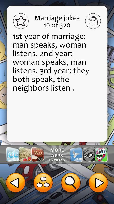 Marriage Jokes is a comprehensive, high-quality app from Jokes for All Occasions suite. Read hundreds of funniest handpicked jokes and anecdotes. Search for jokes by keywords, share favourite jokes with friends. This handy app allows you to enjoy the funniest jokes at your convenience. Try it now, you won't regret it!