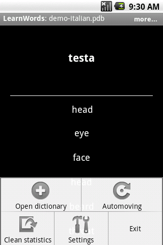 - download dictionaries from site, copy on sd-card and open for study (see menu "Open dictionary")