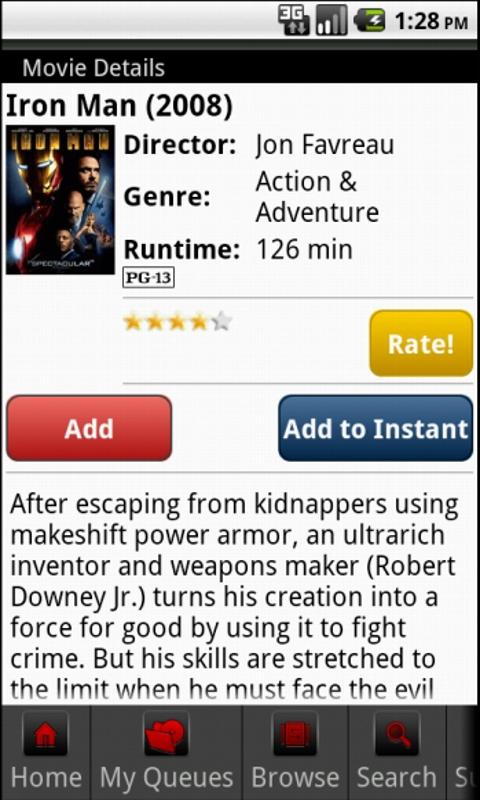 Movela Netflix Queue Manager is a mobile Netflix companion. The application allows Netflix subscribers to search the full Netflix movie library, browse popular Netflix categories and lists, manage your DVD and instant queues, rate titles, find similar titles, and more!