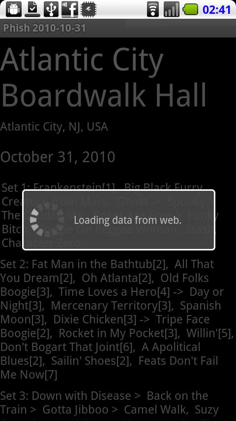 Update now! Browse any past phish show, easy access to recent shows, and show reviews. All data (c) 2010 The Mockingbird Foundation (http://mbird.org) and Phish.net (http://phish.net). Used with permission. Please submit all bugs to the developer.
