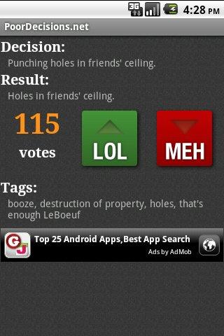 PoorDecisions.net is a website/app devoted to peoples dumb decisions and their hilarious aftermaths. Ever done something then immediately though Wow that was dumb? Of course you have, and this app is made for you. Here you can read all of the poor decisions, vote on them, and even submit your own!