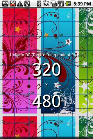 This application displays your screen resolution in Device Independent Pixels. Useful for developers who want to create pixel perfect user interfaces that work across various Android devices. Reacts to orientation changes.