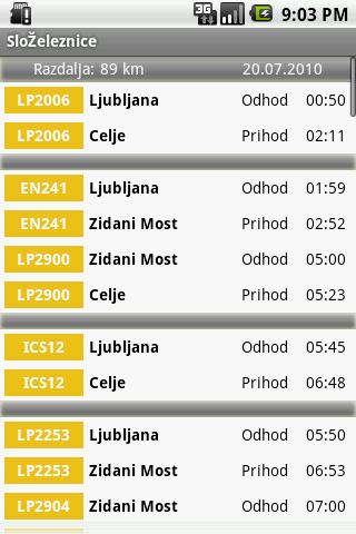 departures, arrivals and travel times on a specific train route in Slovenia.