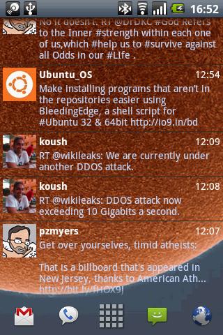 Sonet homescreen widgets display status updates from social networking accounts, Twitter, Facebook & MySpace. The text color and size, and background colors are customizable. Widgets are scrollable with supporting launchers: ADWLauncher, Home++