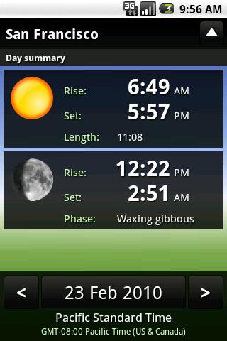 Calculates sunrise, sunset, twilight, golden hours, length of day, moonrise & moonset times for anywhere in the world. Handy for photography, hunting, outdoor activities, planning holidays and astronomy. Four widgets are included so the information is at your fingertips when you need it.