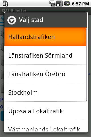 Application for buying subway/bus tickets using SMS Swedish cities. Stockholm Lokaltrafik SLÖstgötaTrafiken Uppsala Stadstrafik/RegionLänstrafiken SörmlandVästtrafikLänstrafiken ÖrebroVästmalands lokaltrafikHallandstrafikenUmeå TIPS menu->välj stad