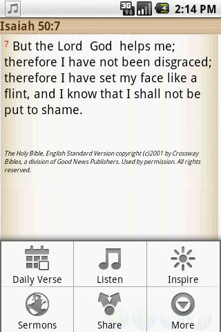 A free open sourced Android Bible. Features-DesiringGod.org(John Piper) Sermon integration-Offline Bible Texts-KJV and ESV Audio Bible-Bible Word Search-Daily Verse widget-Flick through books-Media controls-Customize font and…