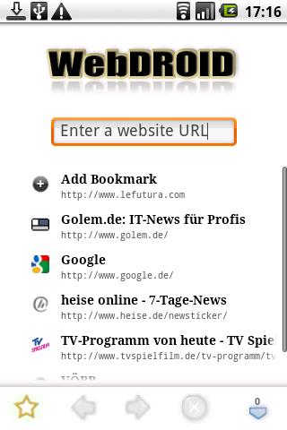 This is the WebBrowser WebDROID2 with Tab-Browsing V2.40 (30.11.2010)Fixed some Bugs - Navigation at top or bottom- Tab browsing- Zoom in: with a double-touch- Zoom…