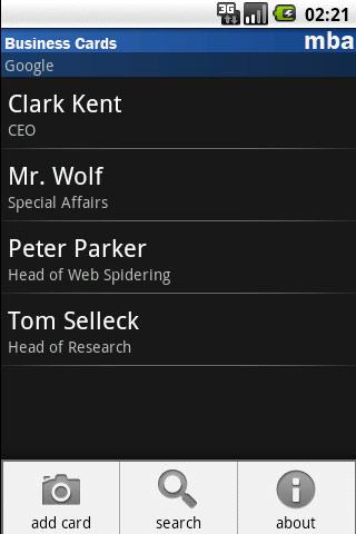 Latest changes:* Bugfixes Take a picture of your business cards. Organize them by organisation and Person. View and zoom your business cards. Search them. Send…
