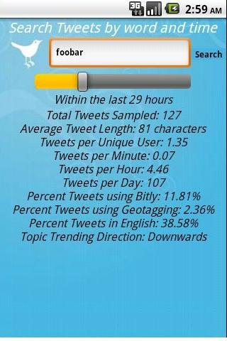 Do you want to get real-time stats about your favorite Twitter topics, users, groups or keywords? TweetStats provides a range of useful data such as Average Tweet Length, Tweets per user, Percent of tweets with Geotags, Trending Predictions...etc. TwitterStats also provides time-window filters for fine-grained analysis.