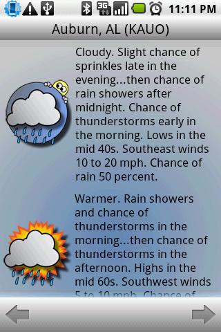 Weather Buddy is a free (donate version available!), lightweight weather application for the US. It pulls current conditions and 6 day forecast from Weather Underground, Inc.