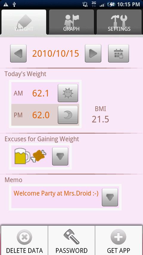 BMI value automoatically calculated from your average weight of the day and your height in the SETTINGS tab.
