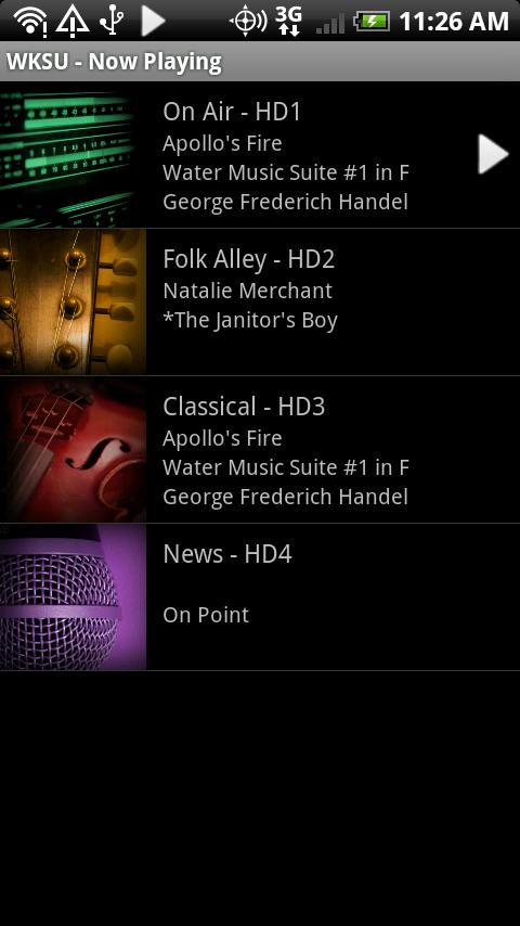 Navigate easily between WKSU’s four streams: the station’s award-winning public radio programming, Folk Alley – all folk, all the time, 24/7 classical music and WKSU’s news channel from WKSU, NPR and beyond.