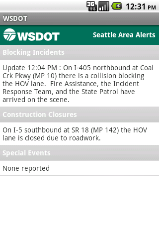 The WSDOT mobile app contains Seattle traffic and travel info for the state of Washington. Includes statewide traffic cameras, high priority travel alerts, mountain pass reports, ferry schedules and alerts, ferry vessel watch, and northbound Canadian border wait times.
